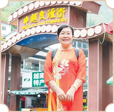 身著“奧黛”的中國(guó)游客在中越友誼街前留影。