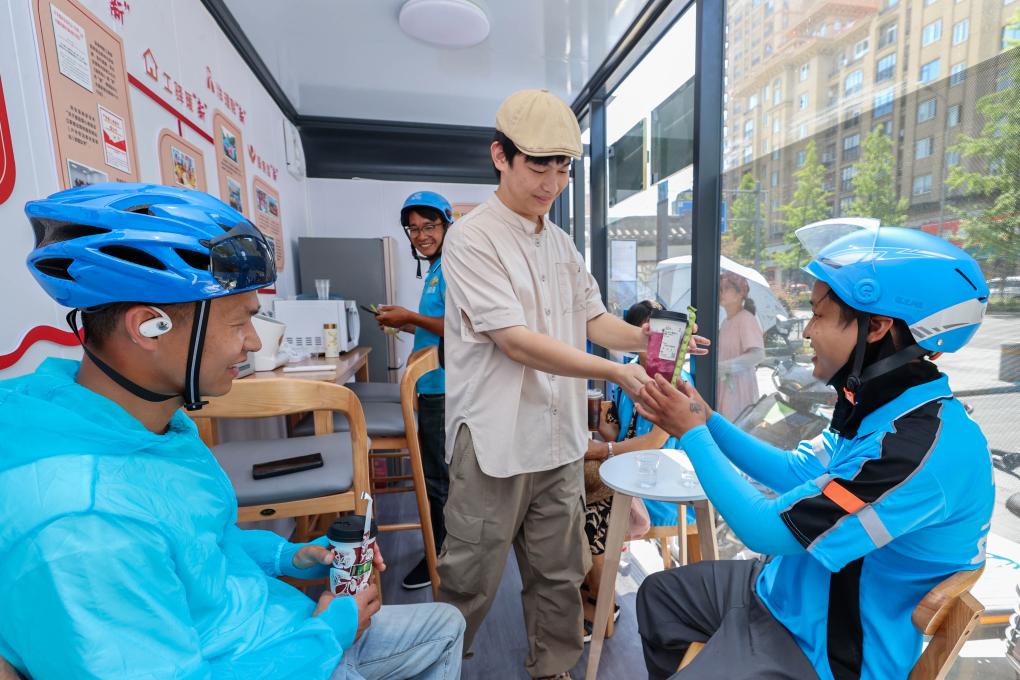 7月2日,在浙江省湖州市德清縣總工會設(shè)置的工會驛站里,愛心商家為外賣小哥送上冷飲。新華社發(fā)(姚海翔攝)