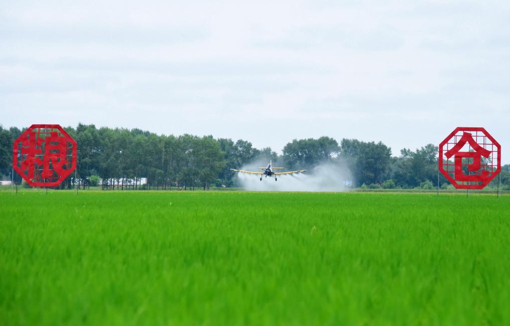 7月1日,在北大荒集團(tuán)黑龍江綏濱農(nóng)場有限公司龍泉管理區(qū),一架農(nóng)用飛機(jī)進(jìn)行航化作業(yè)(無人機(jī)照片)。新華社發(fā)(李興攝)