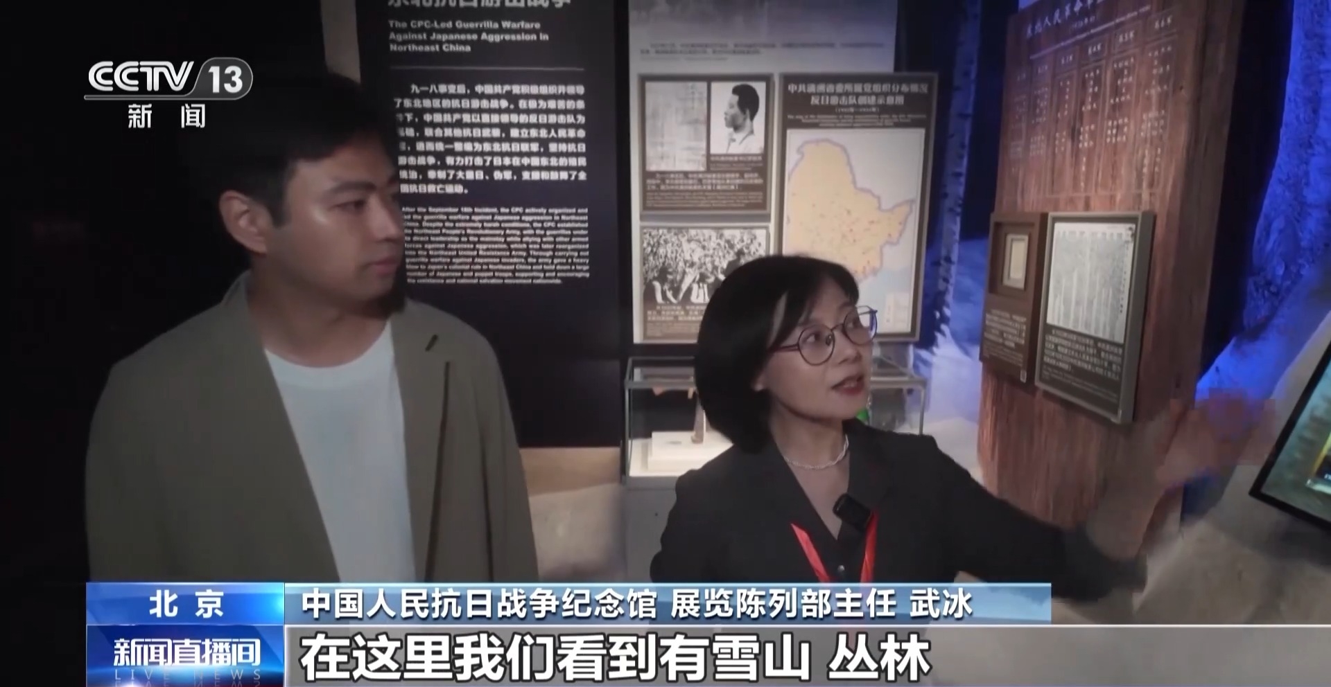 中國人民抗日戰(zhàn)爭紀(jì)念館 展覽陳列部主任 武冰:現(xiàn)在我們來到的這個(gè)空間就是東北抗聯(lián),在這里我們看到有雪山、叢林,在這里還增加了松樹的樹種,圖片、文物全部放置在了雪山當(dāng)中。觀眾在行進(jìn)過程當(dāng)中,會(huì)有一種破雪前行、歷史畫面慢慢地呈現(xiàn)出來的感受。像這樣的綜合性的景觀打造,在整個(gè)展覽當(dāng)中大概有十余處。