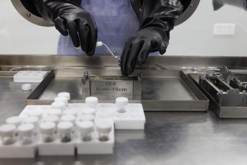 2024年9月24日,科研人員在月球樣品實驗室的解封操作臺上處理嫦娥六號月球樣品。 新華社記者 金立旺 攝