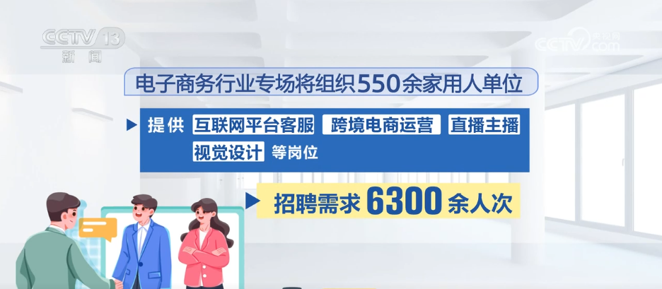 電子商務(wù)行業(yè)專場(chǎng)將組織550余家用人單位,提供互聯(lián)網(wǎng)平臺(tái)客服、跨境電商運(yùn)營(yíng)、直播主播、視覺(jué)設(shè)計(jì)等崗位,招聘需求6300余人次。