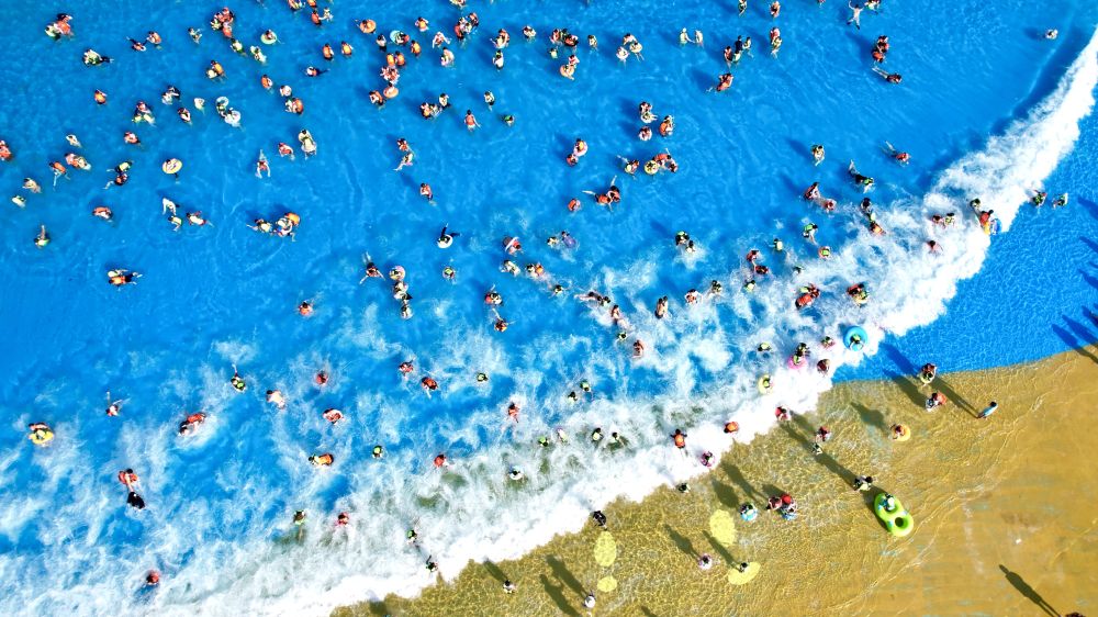 7月5日,浙江省湖州市長興縣太湖圖影旅游度假區(qū)龍之夢樂園嬉水世界,游客親水消暑(無人機(jī)照片)。新華社發(fā)(吳拯 攝)