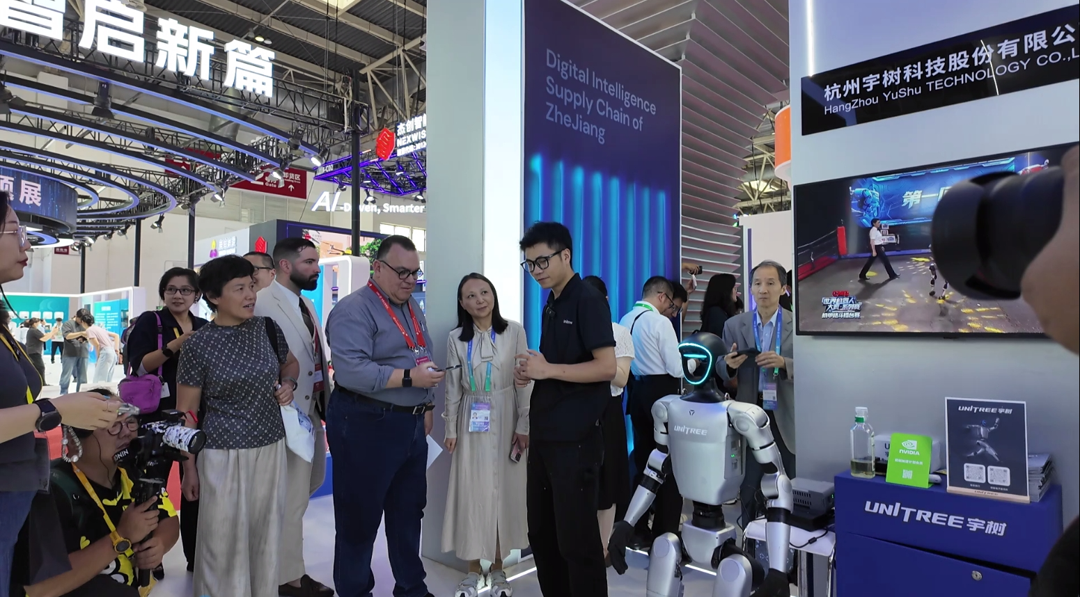 “創(chuàng)新味”還體現(xiàn)在機(jī)器人的身影多了。在英偉達(dá)展臺(tái)、湖北人形機(jī)器人展區(qū),以及參與浙江“數(shù)智潮涌 龍躍浙里”主題專區(qū)的宇樹科技和強(qiáng)腦科技展臺(tái),靈巧手、機(jī)器狗、工業(yè)機(jī)器人、人形機(jī)器人等產(chǎn)品吸引著不少中外觀眾上前互動(dòng)體驗(yàn)。