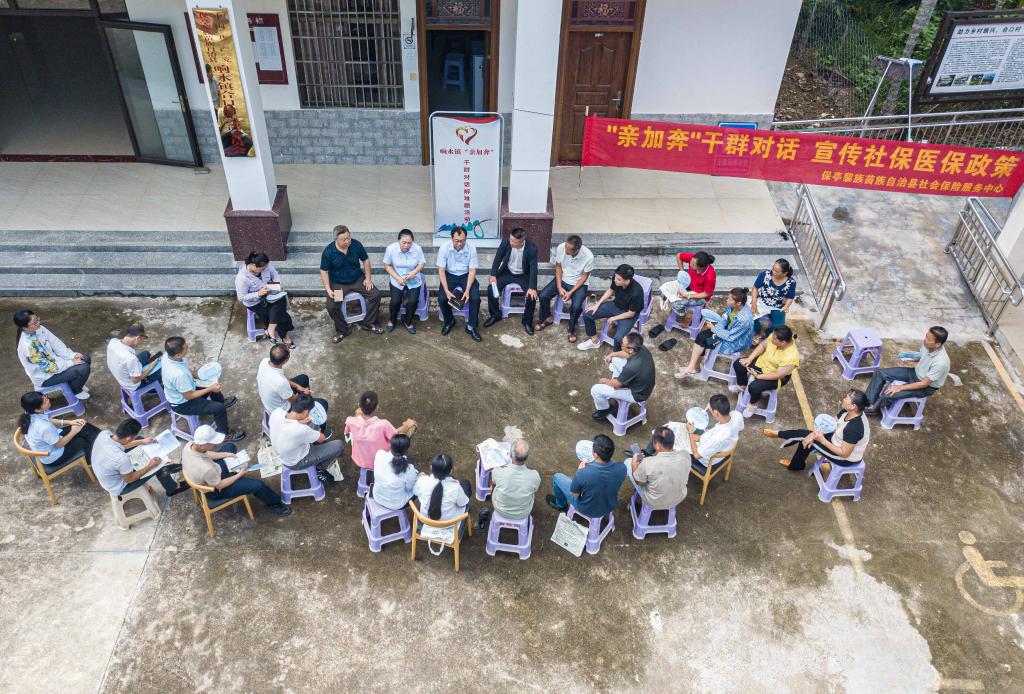 7月16日,在海南省保亭黎族苗族自治縣響水鎮(zhèn)合口村拍攝的“親加奔——干群對(duì)話解難題”活動(dòng)現(xiàn)場(chǎng)(無人機(jī)照片)。新華社記者蒲曉旭 攝
