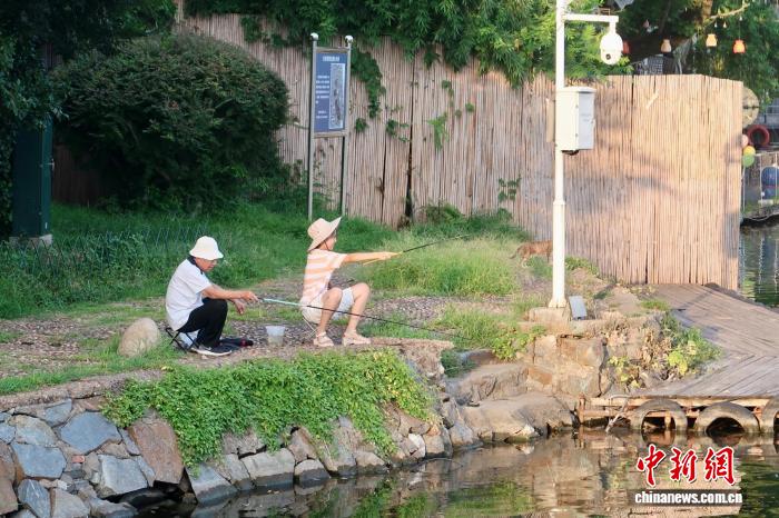7月19日,江西省南昌市八一公園內(nèi),釣魚愛(ài)好者持小魚竿悠哉垂釣。朱瑩 攝