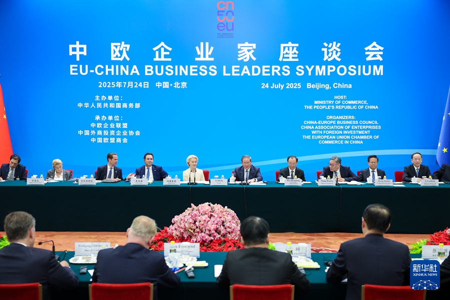 國務(wù)院總理李強7月24日下午在北京人民大會堂同歐盟委員會主席馮德萊恩共同出席中歐企業(yè)家座談會。近60位中歐商會和企業(yè)負責(zé)人出席。
