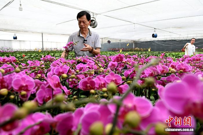 7月16日,臺胞王耀宗在位于福建漳州市南靖縣的天農(nóng)蘭花園里查看蝴蝶蘭長勢?!≈行戮W(wǎng)記者 呂明 攝