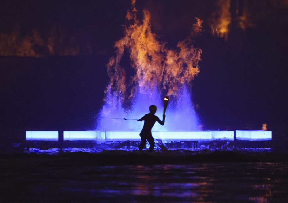 此次開幕式進(jìn)行了世運會歷史上第一次主火炬點燃儀式,主創(chuàng)團(tuán)隊經(jīng)過多輪研討,采取火在噴泉中燃燒作為主要創(chuàng)意點,通過精心設(shè)計,讓天然氣向上穿過水柱,實現(xiàn)節(jié)能燃燒。