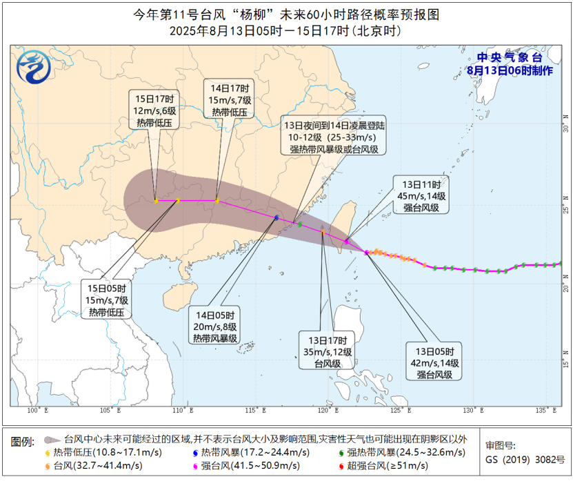 預(yù)計(jì),“楊柳”將以每小時(shí)25-30公里的速度向西偏北方向移動(dòng),強(qiáng)度還將有所加強(qiáng),即將于13日中午前后在臺(tái)灣東南部沿海登陸(臺(tái)風(fēng)級(jí)或強(qiáng)臺(tái)風(fēng)級(jí),40~45米/秒,13~14級(jí));穿過(guò)臺(tái)灣島后13日下午進(jìn)入臺(tái)灣海峽,并將于13日夜間至14日凌晨在福建廈門(mén)到廣東汕頭一帶沿海再次登陸(強(qiáng)熱帶風(fēng)暴級(jí)或臺(tái)風(fēng)級(jí),25~33米/秒,10~12級(jí));以后繼續(xù)向西偏北方向移動(dòng),強(qiáng)度逐漸減弱。