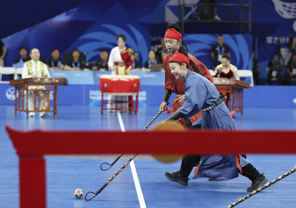 世運(yùn)會(huì)不僅是競(jìng)技的賽場(chǎng),更是文明互鑒的窗口。8月6日,軟式曲棍球項(xiàng)目開(kāi)賽。正式比賽之前,一場(chǎng)別開(kāi)生面的“比賽”率先上演。循著鼓點(diǎn)、琴聲,演員們身著唐裝球衣競(jìng)逐竹編彩球,一場(chǎng)金堂非遺步打球表演,將現(xiàn)場(chǎng)觀眾帶回到盛唐場(chǎng)景。