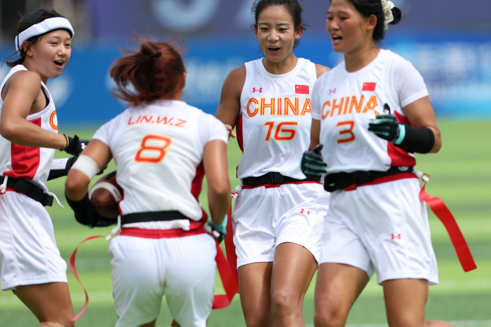 14日,腰旗橄欖球項目開賽。賽場上的激烈比拼與觀眾席上的“雄起”吶喊讓體育場“燃”起來。