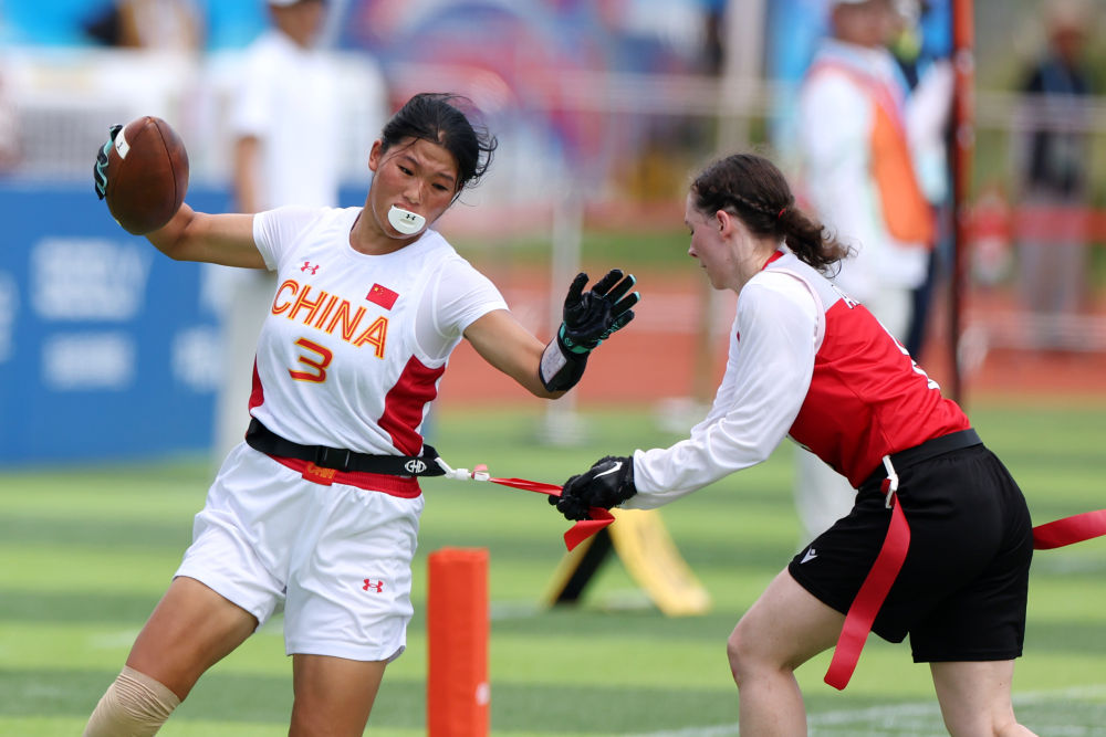 8月14日,在2025年成都世運會腰旗橄欖球女子預(yù)賽A組比賽中,中國隊45:47不敵奧地利隊。圖為中國隊球員高子旋(左)在比賽中。新華社記者 陳斌 攝