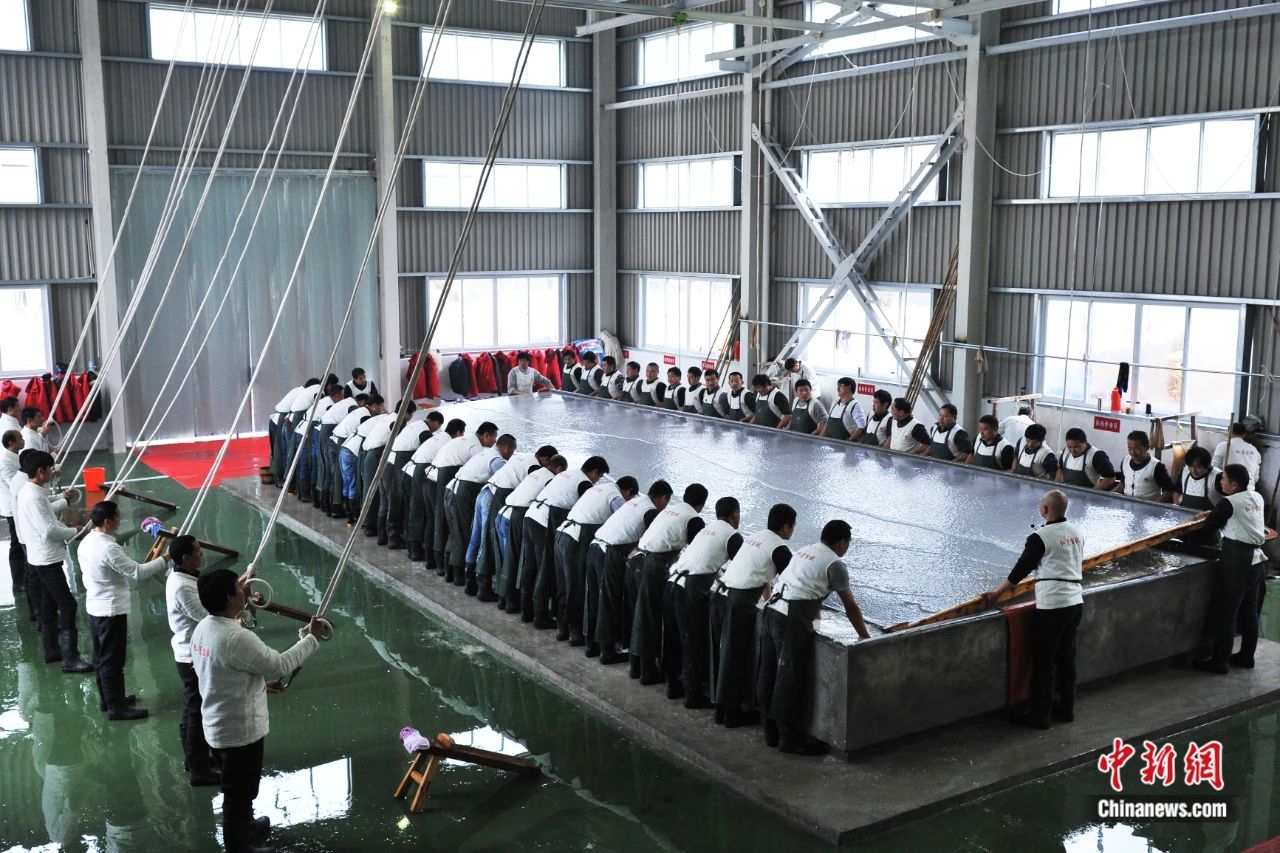 “三丈三”宣紙撈制現(xiàn)場。尹建生 攝