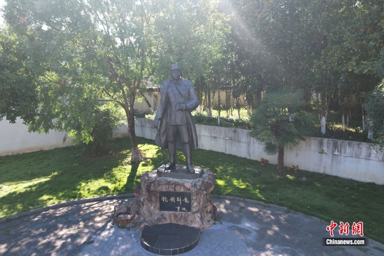 坐落在安徽涇縣云嶺鎮(zhèn)新四軍軍部舊址前的葉挺雕像。(無人機(jī)照片)張強(qiáng) 攝