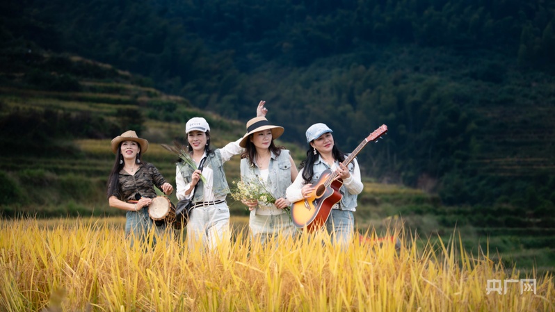 游客們手里的長(zhǎng)槍短炮對(duì)準(zhǔn)半山腰的梯田,咔嚓聲響個(gè)不停。航拍鏡頭下,沉甸甸的谷穗隨風(fēng)搖曳。幾名熱愛音樂的游客在梯田中央彈起吉他,驚飛成群白鷺,雪白的翅膀掠過湛藍(lán)晴空。