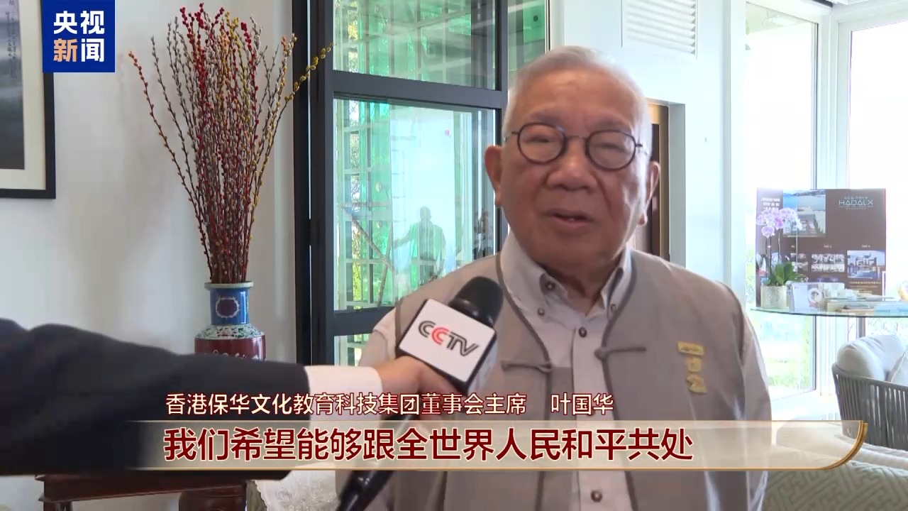 香港保華文化教育科技集團(tuán)董事會(huì)主席 葉國(guó)華:我一般看電視都坐著。今天我不是坐著而是站著。因?yàn)槲矣米钭鹁吹男膩?lái)看。習(xí)近平主席講話精神是,我們希望能夠跟全世界人民和平共處,能夠以構(gòu)建人類命運(yùn)共同體來(lái)帶動(dòng)全球。
