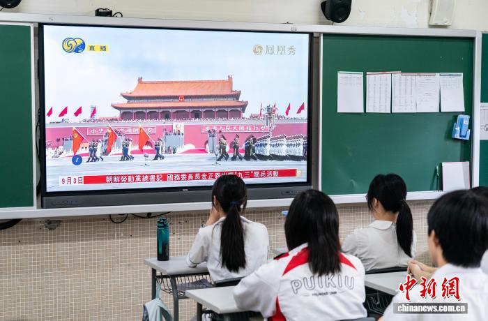 9月3日,香港培僑中學(xué)學(xué)生觀看紀念中國人民抗日戰(zhàn)爭暨世界反法西斯戰(zhàn)爭勝利80周年大會直播。中新社記者 侯宇 攝
