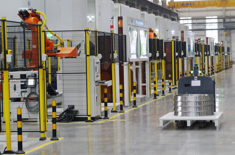 5月22日,自動(dòng)導(dǎo)引車在洛軸集團(tuán)智能工廠生產(chǎn)線上作業(yè)。新華社記者 李嘉南 攝