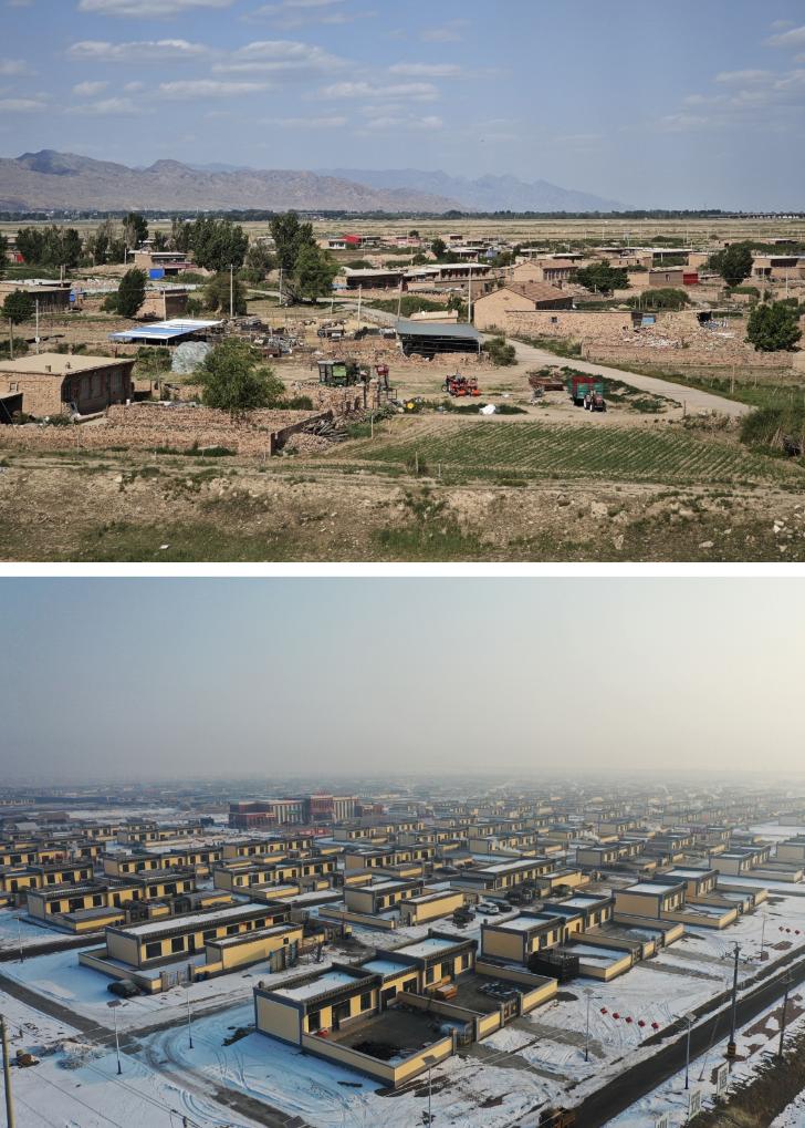 拼版照片:上圖為2023年6月8日拍攝的田家圪旦村拆除前村貌(新華社記者賈立君攝);下圖為2024年2月7日拍攝的田家圪旦新村村貌(無(wú)人機(jī)照片,新華社記者李志鵬攝)。新華社發(fā)