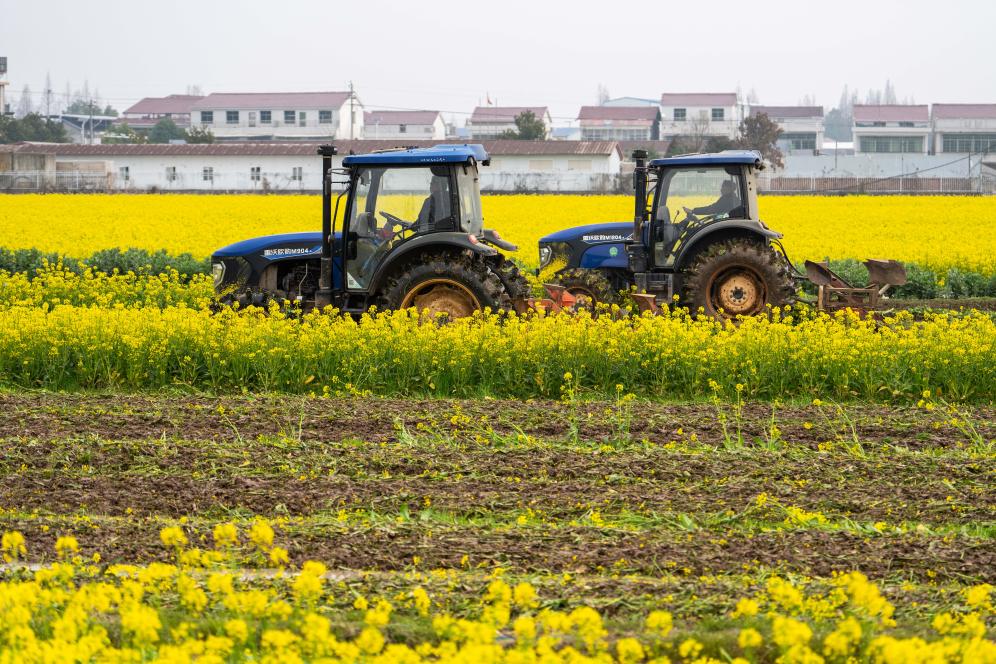 2025年2月25日,在沅江市草尾鎮(zhèn)樂(lè)園村,村民操作旋耕機(jī)翻耕芥蘭綠肥。新華社記者 陳思汗 攝