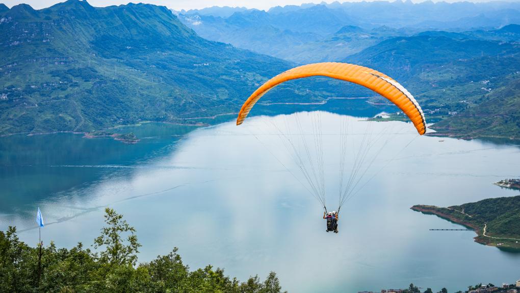7月9日,游客在教練的陪同下體驗(yàn)低空滑翔飛行。滑翔傘這一低空旅游項(xiàng)目成為了貴州省六盤水市眾多游客的新選擇。新華社記者 陶亮 攝