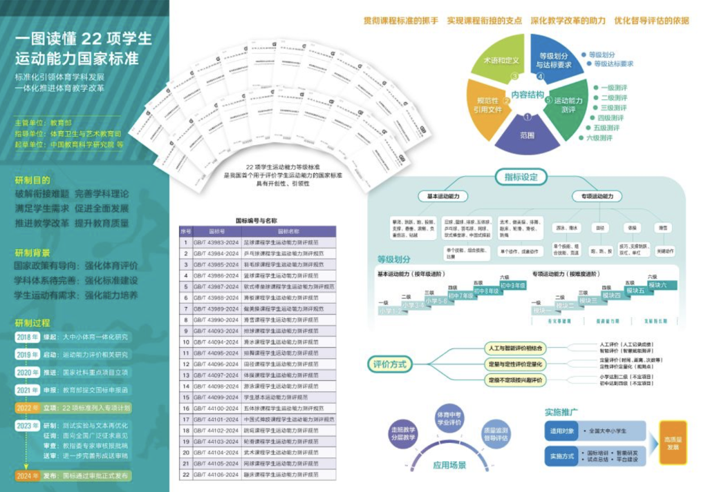 標準研制牽頭人、中國教育科學研究院體育美育教育研究所所長于素梅介紹:“這套國家標準包含足球、籃球等21項專項運動能力和1項基本運動能力,每項標準都劃分六個等級且逐級提升?;具\動能力六個等級與學段年級對應,專項運動能力六個等級按難度進階劃分為三期?!?/p>