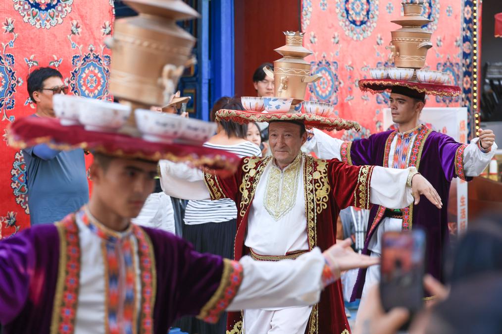7月22日,在新疆庫車市的龜茲小巷,表演薩瑪瓦爾舞的演員參與當(dāng)?shù)氐囊粓龌槎Y活動(dòng)。新華社記者 王菲 攝