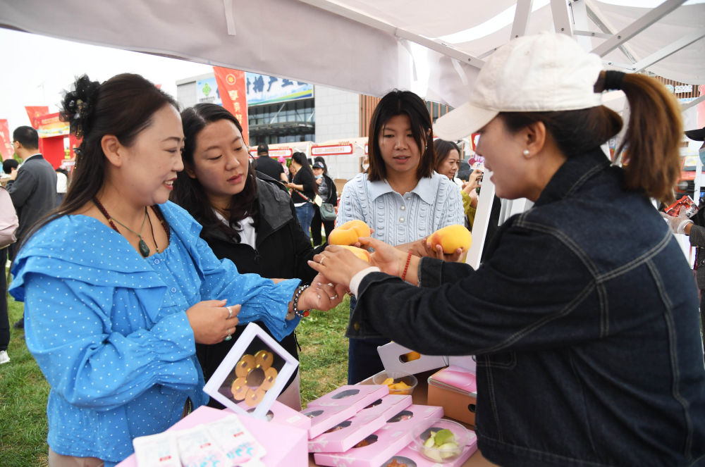 9月19日,北京市平谷區(qū)舉辦2025年中國(guó)農(nóng)民豐收節(jié)暨第36屆北京農(nóng)民藝術(shù)節(jié)“鄉(xiāng)村大舞臺(tái)”平谷區(qū)專(zhuān)場(chǎng)展演。工作人員(右一)在活動(dòng)現(xiàn)場(chǎng)向市民介紹農(nóng)產(chǎn)品。新華社記者 任超 攝