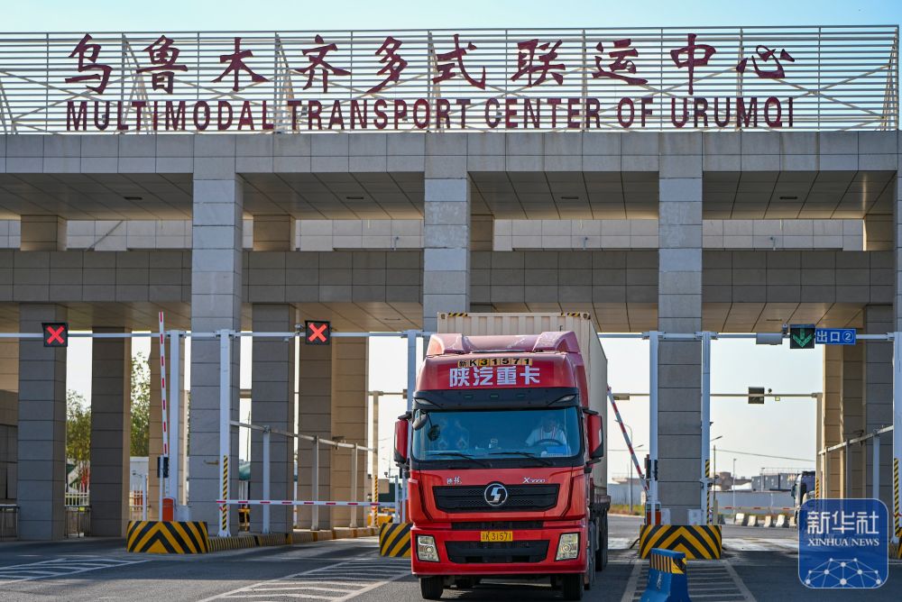 ↑9月15日,一輛貨車駛入位于新疆烏魯木齊國際陸港區(qū)的烏魯木齊多式聯(lián)運中心。