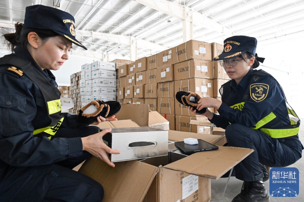 ↑9月17日,新疆塔城海關工作人員在巴克圖口岸集中查驗區(qū)檢查一批經(jīng)由該口岸運往哈薩克斯坦的鞋品。
