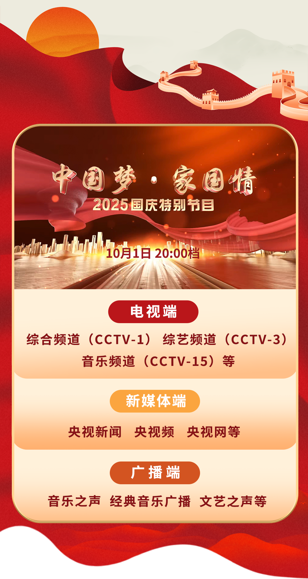 金秋潑彩山河醉,家國同輝氣象新。10月1日晚八點,《中國夢 家國情——2025國慶特別節(jié)目》將在《我愛你中國》的大合唱中拉開大幕。特別節(jié)目走進城市地標與文化遺址,展現(xiàn)山河新貌與奮斗者群像。經(jīng)典曲目、交響合唱、新創(chuàng)歌曲傳遞濃濃家國情懷。抗戰(zhàn)老兵、奧運冠軍、各行各業(yè)奮斗者深情講述……整場節(jié)目,洋溢著中華民族偉大復興勢不可擋的壯志豪情。