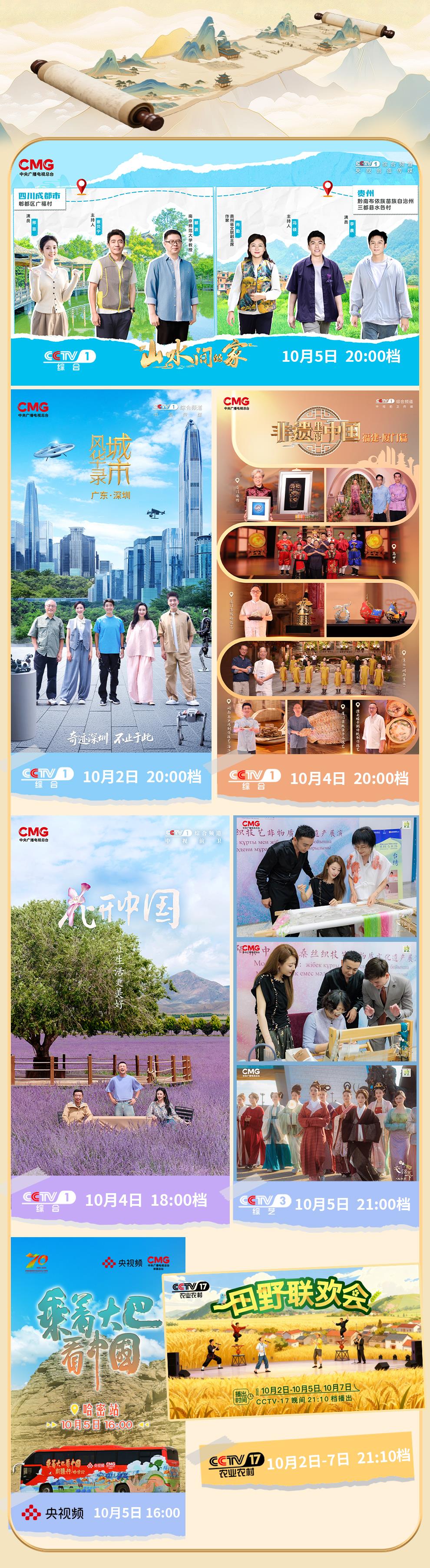 八天假期,想好去哪兒玩了嗎?來,跟著總臺去打卡!頭兩站:四川、貴州!《山水間的家(第四季)》“山水小分隊”邀你在川西林盤探韭香產(chǎn)業(yè),在黔南山鄉(xiāng)看巖椒成林。第三站:廣東。《城市風華錄》帶你去深圳探訪全球首家機器人6S店,感受“奇跡之城”向新向好的澎湃動力。第四站:福建。珠繡、漆線雕、閩南童謠、高甲戲……看《非遺里的中國》,領略廈門非遺之美。第五站:新疆。從《花開中國》開啟一場跨越天山的芬芳之旅,在《衣錦天下 絲路季》發(fā)現(xiàn)絲綢之路上的中國審美,《乘著大巴游中國》探尋哈密甜美密碼。第六站:內(nèi)蒙古。在通遼參加《田野聯(lián)歡會》,體驗鄉(xiāng)土文化新活力。這八天的旅程,你不會錯過雄奇的風光、古老的文化、新奇的創(chuàng)造,還有熱氣騰騰的生活。