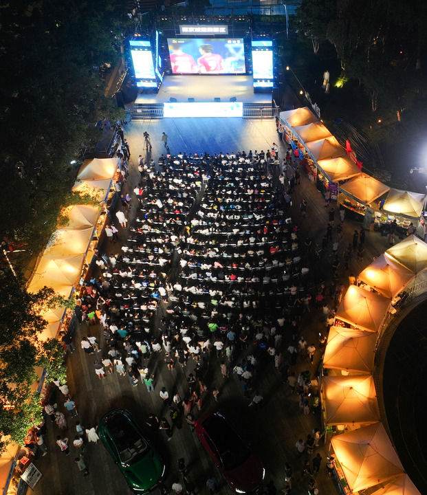 8月17日,球迷在南京一個露天屏幕前觀看2025江蘇省城市足球聯(lián)賽(“蘇超”)第九輪比賽。新華社記者 季春鵬 攝