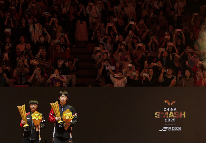 10月3日,在北京舉行的2025年世界乒乓球職業(yè)大聯(lián)盟(WTT)中國大滿貫賽混合雙打決賽后,冠軍中國組合王楚欽(右)/孫穎莎在頒獎儀式上。新華社記者 鞠煥宗 攝