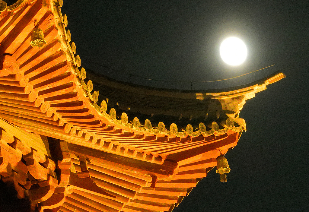 一輪圓月從浙江省臺州市仙居縣安洲塔上空升起。