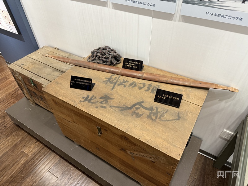 展柜中兩塊陳舊的紅色磚塊,銘刻著“史上最牛燒磚工”的故事?!爱?dāng)時(shí),為了能盡快恢復(fù)科研和教學(xué)工作,中國(guó)科大師生親手燒制了建造化學(xué)樓的紅磚,其中很多老師、學(xué)生如今已經(jīng)成長(zhǎng)為教授甚至院士,所以我們也經(jīng)常戲稱(chēng)這群燒磚工為‘史上最牛燒磚工’?!蓖趺A介紹。