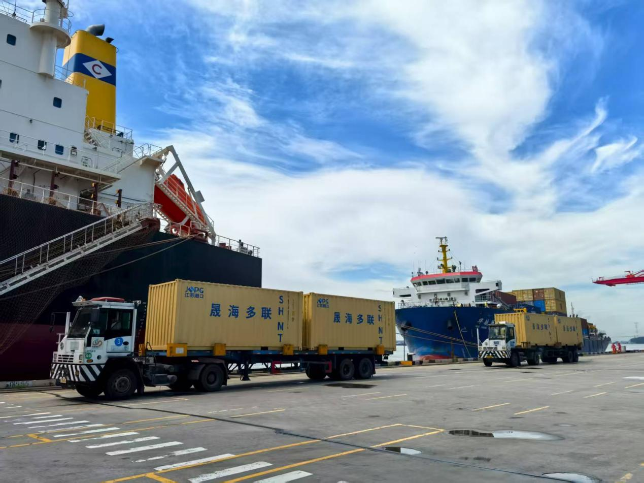 在智慧港口軟硬件升級(jí)的同時(shí),物流運(yùn)輸模式的創(chuàng)新同樣成為“水運(yùn)江蘇”提質(zhì)增效降本的關(guān)鍵引擎。走進(jìn)龍?zhí)惰F路堆場(chǎng),只見(jiàn)滿載煤炭的35噸敞頂箱經(jīng)鐵路專列直抵港區(qū),“集改散”吊具精準(zhǔn)抓箱,液壓翻轉(zhuǎn)卸煤,煤炭直輸貨輪。同時(shí),滿載集裝箱的“南京-洋山”沿江海鐵班列正整裝待發(fā),即將駛向上海洋山港銜接國(guó)際干線班輪。整個(gè)鐵水聯(lián)運(yùn)流程高效銜接,一氣呵成。這正是江蘇港口物流集團(tuán)晟海公司創(chuàng)新打造的多元化聯(lián)運(yùn)新格局。