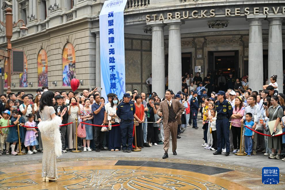 國(guó)慶中秋假期,在天津金街,經(jīng)典話(huà)劇《日出》片段在此沉浸式上演。演出選址在劇本故事原型——惠中飯店門(mén)前,讓觀眾零距離感受歷史與藝術(shù)交融的魅力?!白屓朔浅s@喜的表演,和劇場(chǎng)演出相比更加身臨其境?!眮?lái)自山東的游客孫女士贊嘆道。