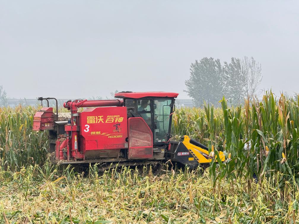 2025年10月11日,在安徽省淮北市濉溪縣百善鎮(zhèn)張莊村,從河南駐馬店調(diào)運過來的履帶式收割機在收割玉米。新華社發(fā)(徐弘揚 攝)