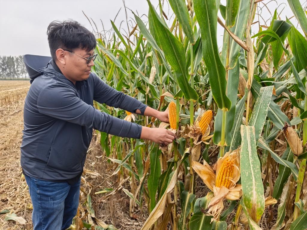 2025年10月10日,安徽省宿州市蕭縣金旺家庭農(nóng)場負責人許大賓查看待收割的玉米品質(zhì)。新華社記者 水金辰 攝