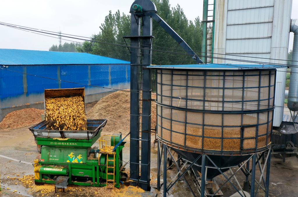 2025年10月10日拍攝的河北省衡水市阜城縣古城鎮(zhèn)一家糧食烘干企業(yè)作業(yè)現(xiàn)場(無人機照片)。新華社發(fā)(崔賢飛 攝)