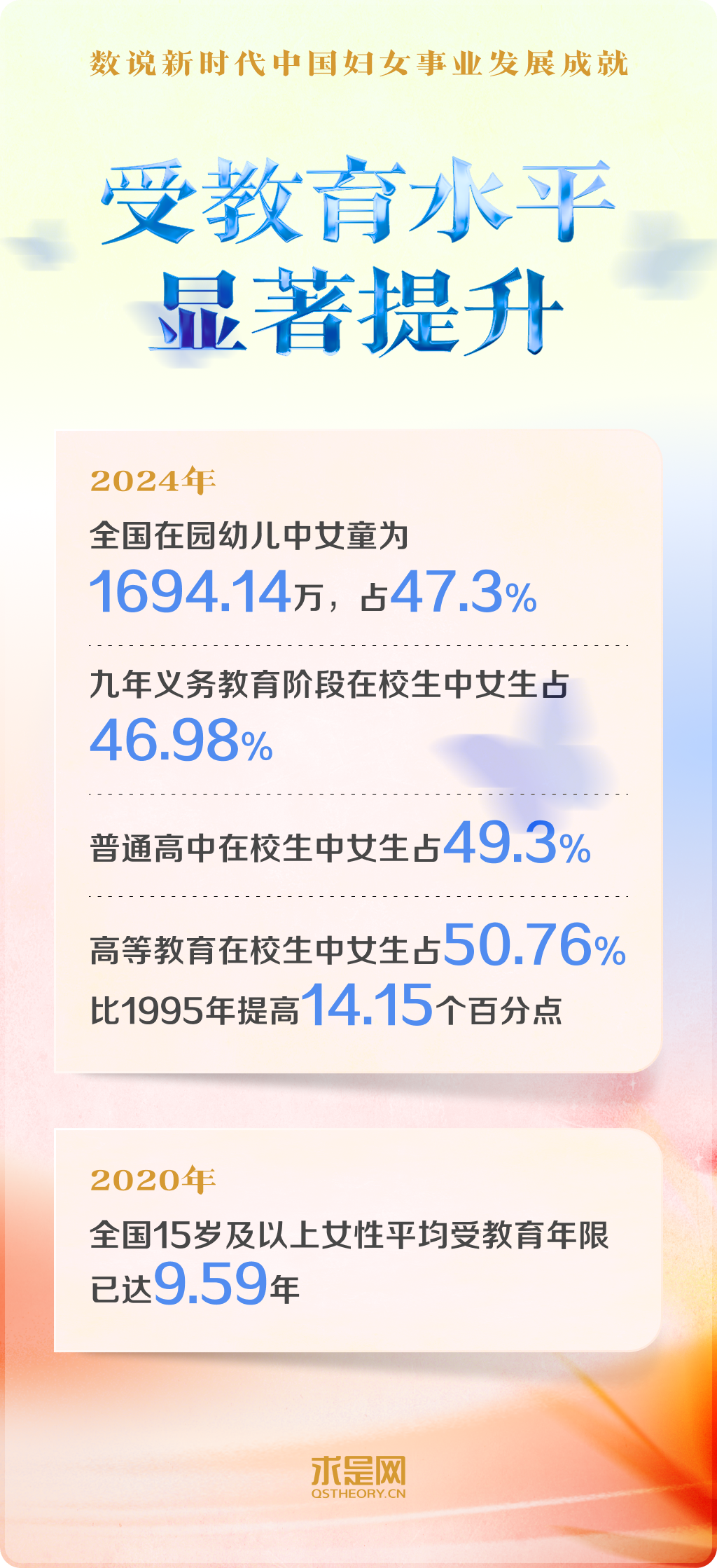 黨的十八大以來,以習(xí)近平同志為核心的黨中央把保障婦女合法權(quán)益、促進(jìn)男女平等和婦女全面發(fā)展,作為中國式現(xiàn)代化的重要內(nèi)容,對婦女事業(yè)發(fā)展作出一系列開創(chuàng)性、全局性、長遠(yuǎn)性的重大決策部署。中國在幼有所育、學(xué)有所教、勞有所得、病有所醫(yī)、老有所養(yǎng)、住有所居、弱有所扶上持續(xù)用力,不斷實現(xiàn)廣大婦女對美好生活的向往。一組組數(shù)字,記錄下新時代中國婦女事業(yè)跨越式發(fā)展的重大成就。