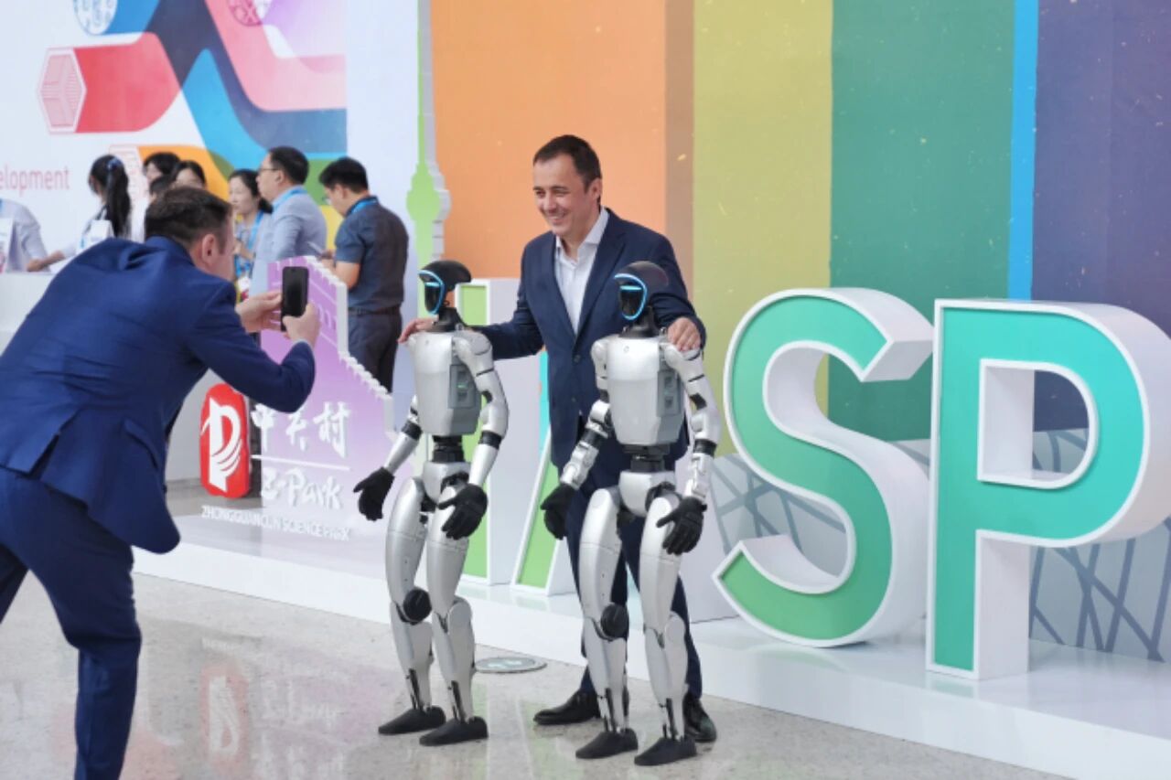 2025年9月17日,國際科技園及創(chuàng)新區(qū)域協(xié)會(IASP)2025年世界大會在北京國家會議中心開幕。圖為外籍嘉賓在大會現場同機器人合影。中新社記者 張祥毅 攝
