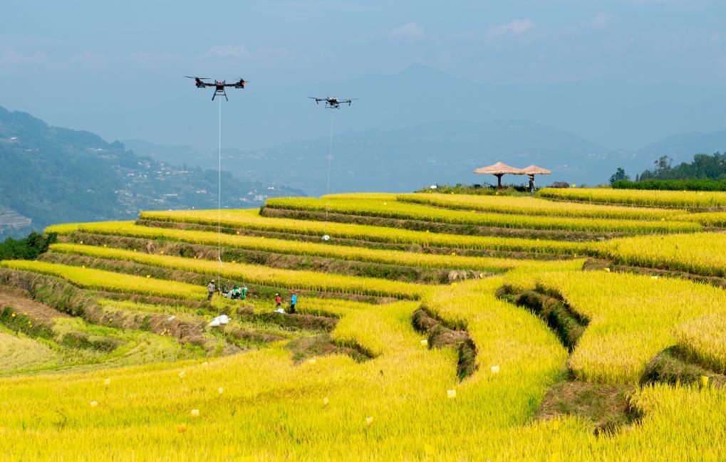 10月10日,湖北省秭歸縣沙鎮(zhèn)溪鎮(zhèn)長春村村民用無人機轉(zhuǎn)運收獲的水稻(無人機照片)。新華社發(fā)(雷勇攝)
