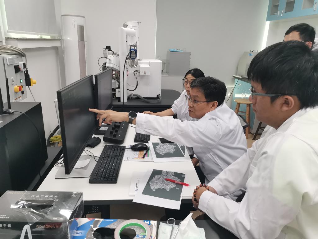 2024年8月26日,徐義剛院士與團隊成員通過掃描電鏡觀察嫦娥六號樣品特征。(中國科學院廣州地球化學研究所供圖)
