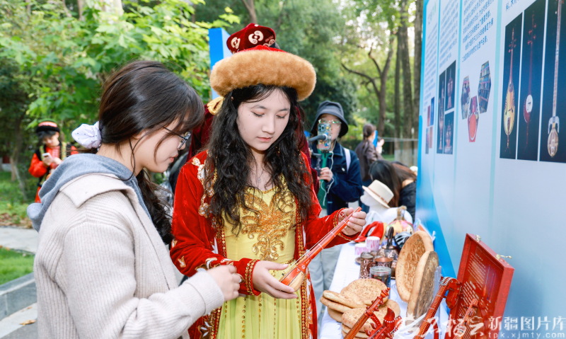 10月27日下午,南京師范大學(xué)(隨園校區(qū))學(xué)生在欣賞新疆樂器。石榴云/新疆日報(bào)記者 甘興華攝