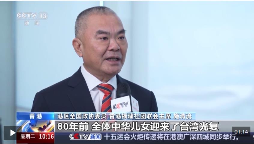 港區(qū)全國(guó)政協(xié)委員 香港福建社團(tuán)聯(lián)會(huì)主席 施清流:80年前,全體中華兒女迎來(lái)臺(tái)灣光復(fù),回歸祖國(guó)的歷史性時(shí)刻,這一偉大勝利值得兩岸同胞銘記。香港各界將銘記歷史,以實(shí)際行動(dòng)推動(dòng)兩岸交流合作,為助力國(guó)家發(fā)展大局貢獻(xiàn)力量,共創(chuàng)中華民族偉大復(fù)興的美好未來(lái)。
