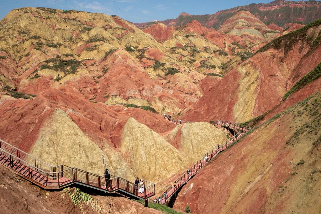 漫步景區(qū),放眼望去,紅色與青灰色交錯分布,恍若置身于一幅水墨丹青中。移步登高,起伏的“彩丘海浪”直通天際。“人在畫中游,我從景中來?!边@是不少游客的感受。