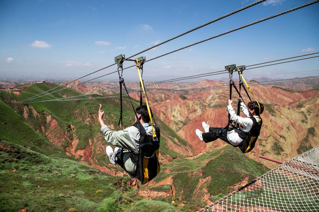 首次體驗低空飛行的游客劉大偉贊嘆:“從空中俯瞰,連綿的彩丘和丹霞地貌猶如大地潑墨而成的瑰麗畫卷,雄渾而又夢幻。”
